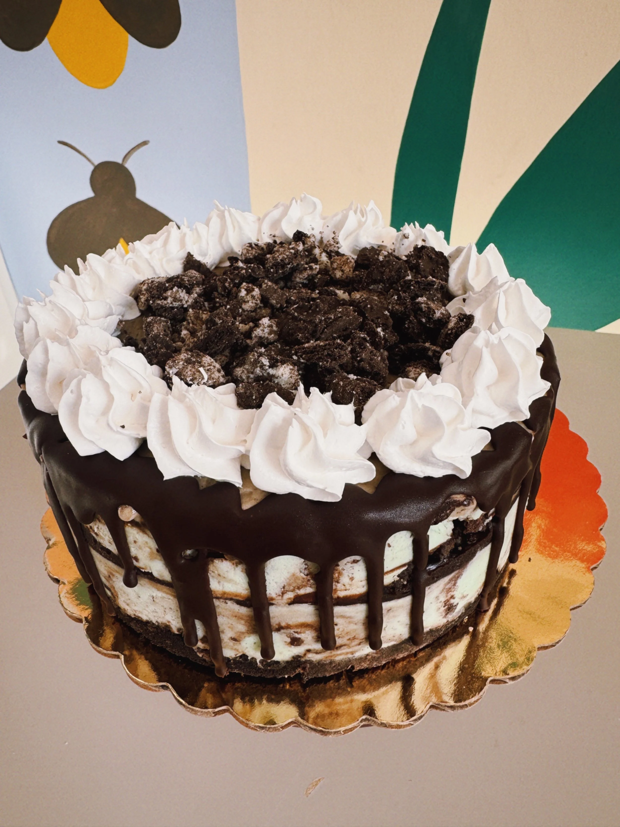 Cool, chocolatey, and a little over the top. This cake starts with a crunchy Oreo crust, piled high with our Mint Avalanche ice cream (mint ice cream packed with fudge swirls and grasshopper cookies). A rich layer of fudge and Oreo crumble runs through the center, followed by another thick layer of Mint Avalanche. Finished with a ring of vanilla icing and even more Oreos on top for the ultimate mint chocolate moment.
