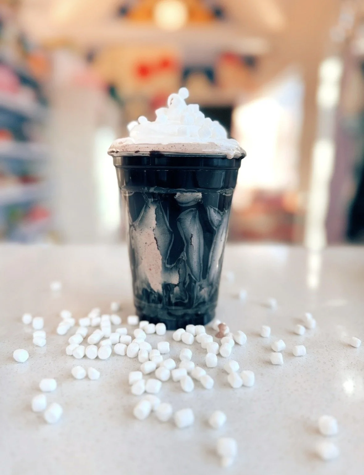 Vanilla ice cream blended with rich hot cocoa and marshmallow, topped with whipped cream and mini marshmallows. Cozy, chocolatey, and just a little undercover.